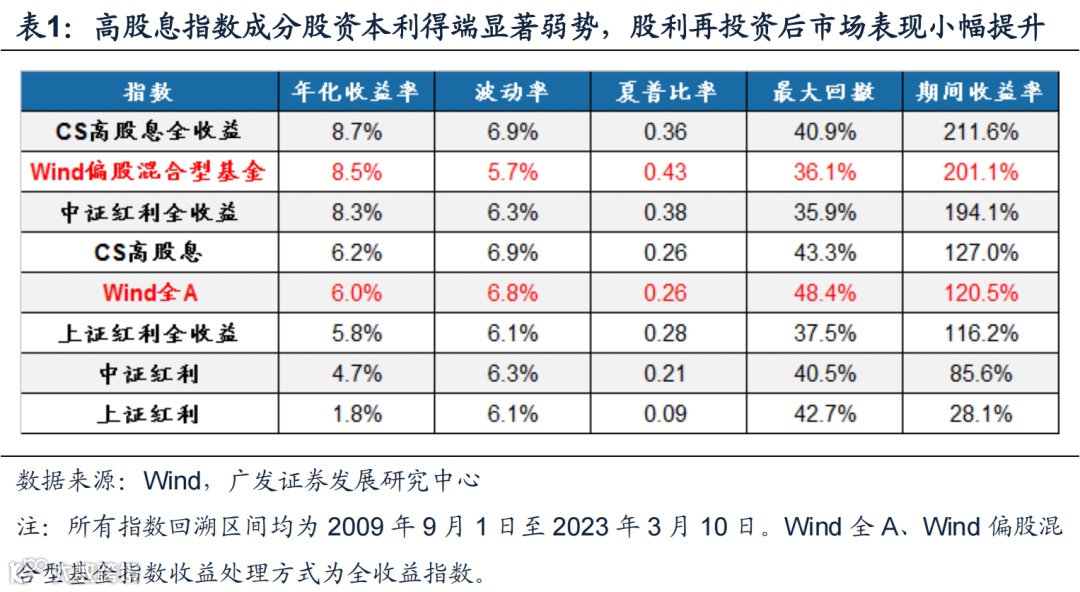 另外一方面,传统高股息策略的波动率和最大回撤表现并不突出——选择高股息策略的投资者往往希望获得两大特征:“低回撤”&“低波动”,但是实际上红利全收益指数在回撤率和波动率控制的表现上和Wind全A相仿,并没有取得显著优势,且显著弱于Wind偏股混合型基金。波动率方面,高股息相关指数月波动率回测期间全部突破6%水平,高于同期Wind偏股混合型基金;最大回撤方面,非股利再投资操作下(价格指数),高股息相关指数回撤小幅跑赢Wind全A,但仍录得40%以上水平,股利再投资后(全收益指数),最大回撤显著改善,但仅中证红利全收益指数小幅跑赢Wind偏股混合型基金。因此从中长期视角来讲,高股息策略并不能相对偏股混合基金获得更显著的“低回撤”和“低波动”特征。