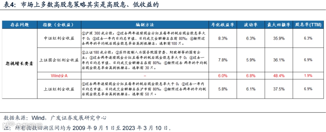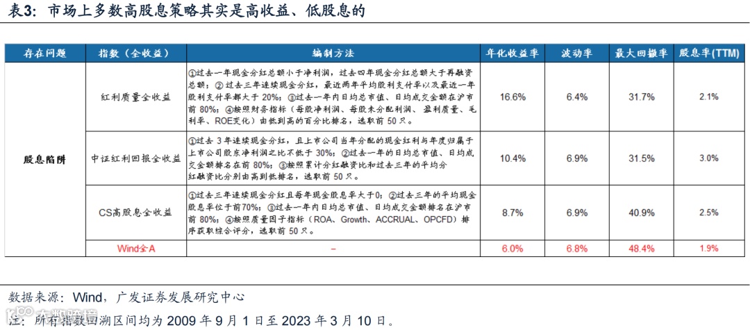●为何传统高股息策略并不能持续跑赢Wind全A?两大核心“病因”:(1)传统高股息策略存在股息陷阱,即以往的高股息并不能保证未来它也是高股息,这导致未来的股息再投资受到影响;(2)传统高股息还存在估值陷阱,即高股息策略的本质是深度价值股策略,企业的盈利端往往缺乏持续的增长,投资者不能获得“与企业共同成长”的收益,这导致策略在资本利得方面容易录得显著的负向贡献的同时,也难以实现真正“低波动、低回撤”的特性。