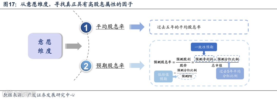 过去12个月的股息率往往不能代表企业未来的分红意愿,所以我们以“(一致性预期净利润*过去5年平均分红比例)/总市值”来计算预期股息率(若无分析师覆盖则用净利润TTM),且该指标也暗示了较低的估值预期水平。