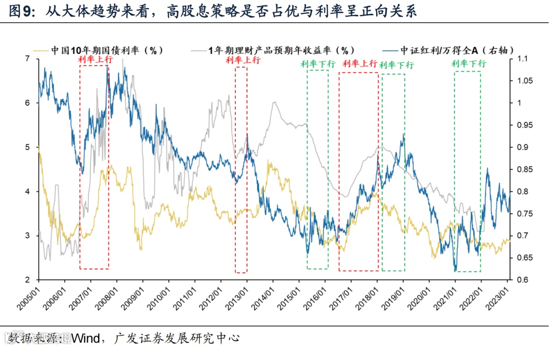 从利率视角来看,许多投资者对高股息策略占优时期的认知有着明显的冲突。部分投资者认为利率下行利好高股息策略:高股息策略具有“类债券”性质,在利率下行期性高股息策略中的股息收益价比提升,此时高股息的股票有望获得从绝对收益方面转移过来的资金(尤其是债券向股票转移)。另一部分投资者认为利率上行利好高股息策略:利率上行时期一般经济表现较好,价格水平处于上升通道,这对周期股和消费股的基本面和股价来说是利好,由于高股息策略中周期股+消费股占比较高,因此此时高股息策略占优。