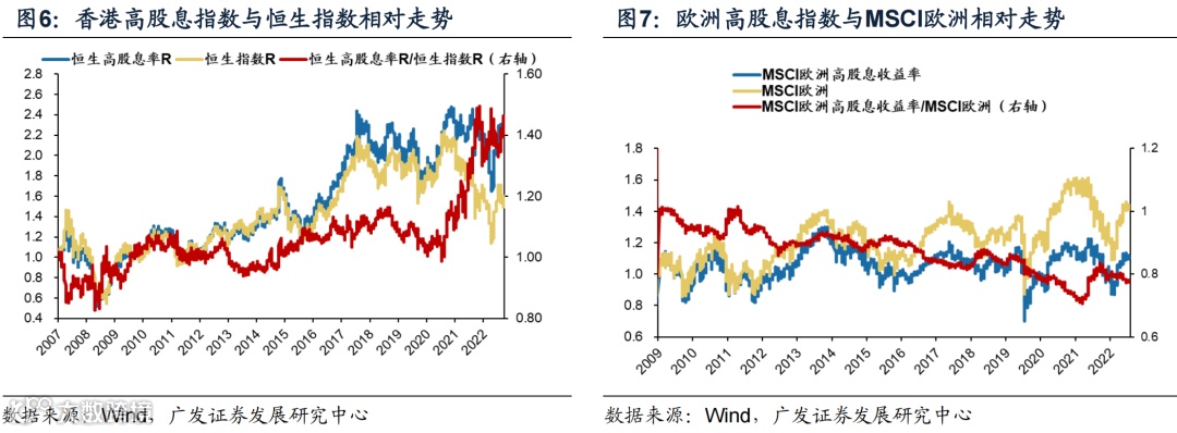 全球视角来看,离岸市场股息指数表现较好,是长期优胜策略;而海外在岸市场的高股息策略总体上未显著跑赢大盘。离岸市场方面,香港高股息指数08年以来持续跑赢恒生指数。07年-08年,香港高股息指数短暂跑输恒生指数之后持续跑赢恒生指数。同时,香港高股息指数在2008年、2015年、2020年指数快速下跌中高股息指数都有不错的表现,有一定的防御能力。海外在岸市场上,高股息策略在美欧市场上均未显著跑赢大盘表现。2000年以来美国高股息指数并不持续占优,但在熊市表示优异。2000年以来,除了2000-2002年高股息指数大幅跑赢标普500外,其余时间段整体未能跑赢大盘。美国高股息指数相对市场的趋势性占优主要出现在2000~2003年、2008年中-2009年,这分别对应互联网泡沫破裂和次贷危机,在两次大型危机中美国高股息指数获得了明显超额收益。2009年以来欧洲的高股息策略持续跑输大盘。2009年以来,欧洲的高股息策略大部分时间都未跑赢大盘指数,并非长期占优策略。