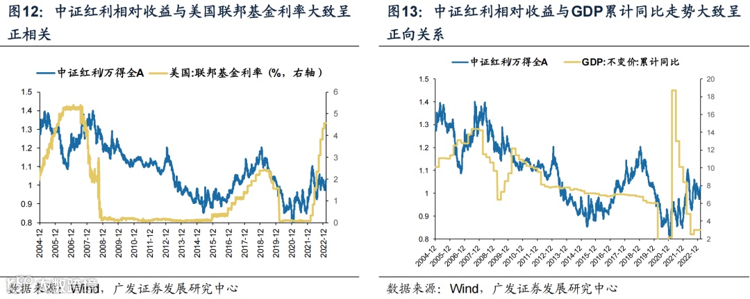 2. 较强相关性:美国联邦基金利率与中国实际GDP同比增速与中证红利相对收益大致上呈现正向关性,新发基金规模与中证红利相对收益大致上呈现负向关性。大体上来看,美国加息周期当中,我国的高股息策略往往占优;而在我国经济持续改善的背景下,高股息占优的概率较大;而新发基金规模与中证红利相对收益呈现弱负相关,这证明市场增量资金较少、存量博弈更为显著时,高股息策略表现更好。
