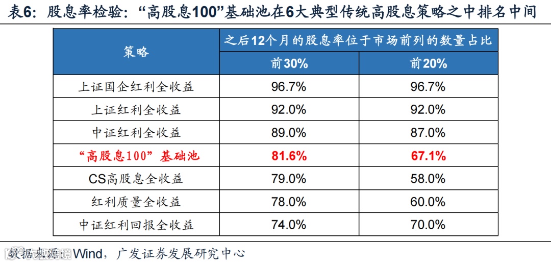 在未来12个月的股息率检验中,“高股息100”基础池也具备了“真正”的高股息特性。A股“高股息100”基础池位于市场股息率前30%的股票数量达81.6%,前20%的股票数量达67.1%,在6大典型传统高股息策略之中排名中间,证明“高股息100”股票池并非“假”高股息策略。