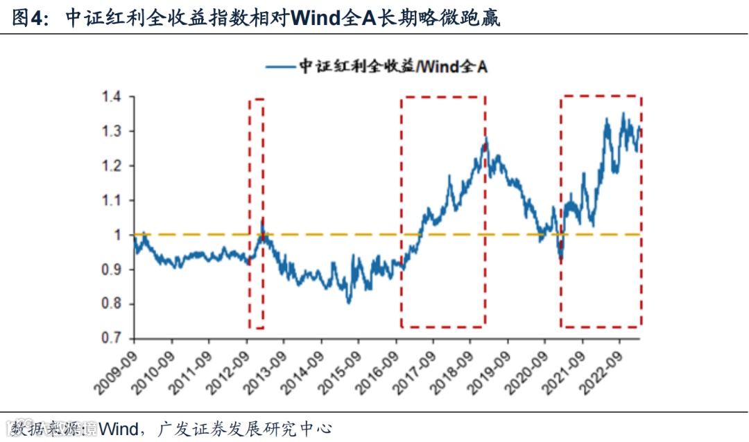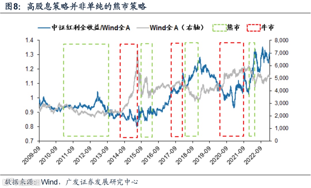 但回顾2009年以来中证红利指数相对Wind全A的市场表现,我们发现这样的认知是有偏差的!在高股息显著占优的期间当中,有相当一部分时间市场身处牛市阶段,其中包括了16-17年牛市、以及21年3月至11月的结构牛市。另一方面,市场大幅走熊也并非高股息策略占优的充分条件,例如在15年6月至16年3月的熊市当中,高股息策略相对Wind全A显著跑输。也就是说,高股息策略并非单纯的熊市策略,其占优阶段在熊市和牛市的比例一样高。