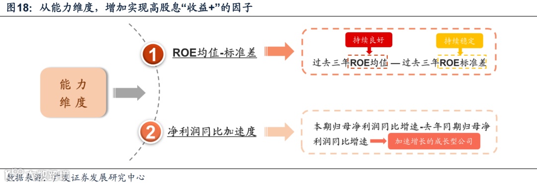 提升盈利能力的筛选可以同时解决两大“病因”下的一些问题:一方面,即使企业分红意愿仍较高,但盈利端净利润同比的下行也无法保证较高的“股息收益”;另一方面,盈利能力欠佳的企业也会存在一定的质量问题,这不仅会导致“资本利得”受损,也会影响到收益的稳定性。所以,我们也主要通过两个指标为构建能力维度——