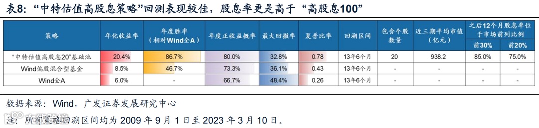 1.“高股息100”是持续占优策略。不仅收益大幅跑赢Wind全A和偏股混合基金指数,且最大回撤更低;同时,从策略净值相对Wind全A的走势来看,策略的占优区间也是不分牛熊,相对基准的年度胜率达到86.7%。
