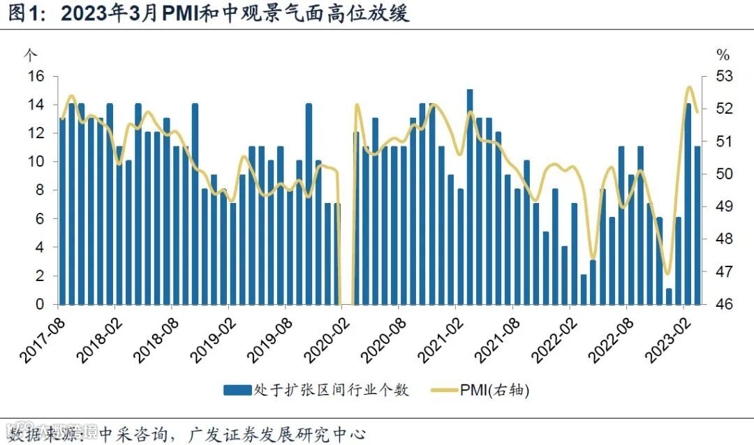 第一,3月制造业PMI小幅回落0.7个点至51.9。从指标拆解看,生产项环比下降2.1个点,拖累PMI 0.5个点,贡献了制造业PMI环比降幅的75%。前期报告《供求环比高斜率修复后的分化调整》中我们已详细阐释了背后的宏观逻辑。1月需求快速恢复,2月生产大幅跟上,3月需求没有进一步加速,带动偏快的生产和库存调整。景气面同样有所走弱,处景气扩张区间的行业数由2月的14个下降至11个,医药、农副食品、石油炼焦由景气扩张进入收缩区间。