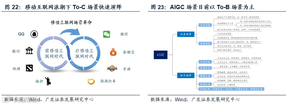 值得一提的是目前AIGC应用场景优先落地以To-B为主,To-C的演绎暂时存在于想象阶段。我们下文会提到,To-C是科技创新周期非常重要的节点,对应着场景广度的大幅提升,是科技投资周期的爆点时刻。