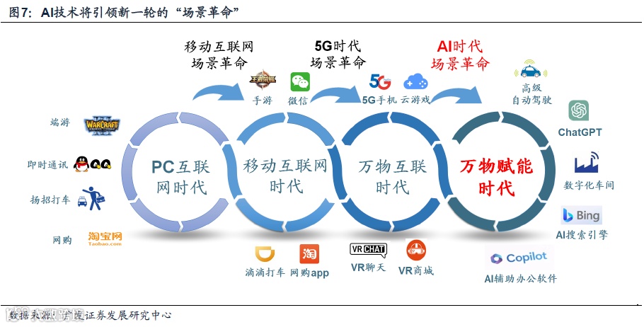 此外,我们在3.30《AI:第四次场景革命-数字经济系列五》中提到,未来AI下游应用迅速爆发也标志着新一轮“场景革命”的到来,推动完成从“万物互联”到“万物赋能”的跨越。(1)在PC互联网时代,即时通讯、网购、端游的出现标志着数字经济的第一次场景革命;(2)智能手机与APP开启了移动互联网时代,以外卖、团购、打车为代表的平台经济掀起了第二次场景革命;(3)2018年,移动互联网进入存量时代,5G技术带来的万物互联推动了第三次场景革命。
