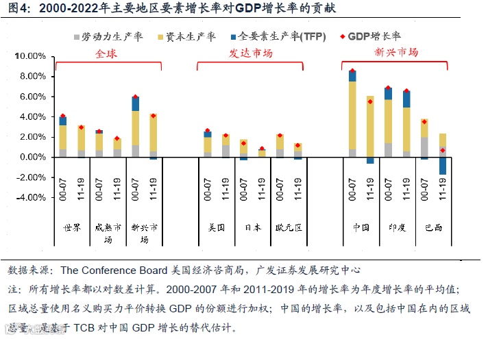 尤其是全球技术进步变缓之后,2010年之后主要国家和地区的“全要素生产率”多出现回落,对GDP贡献度下降明显。据美国经济咨商局测算,全球的全要素生产率由2000-2007年的年均0.80%下降到2011-2019年的年均-0.10%,美国全要素生产率由年均0.60%下降到年均-0.10%,中国全要素生产率则是由年均1.10%下降到年均-0.50%。