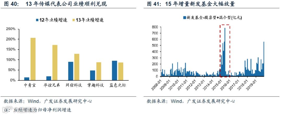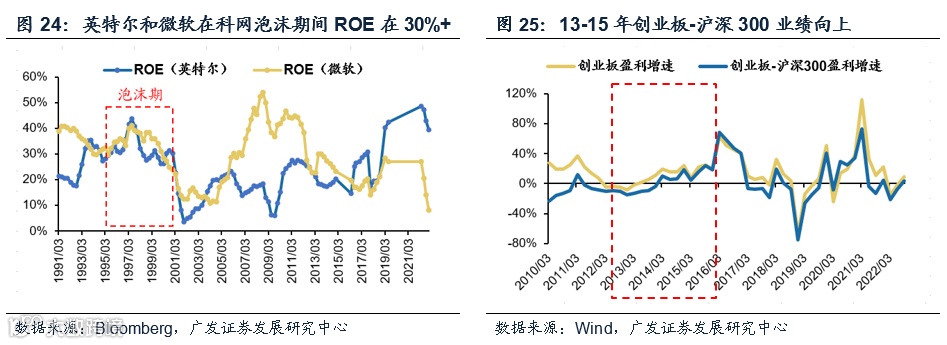 95-99年即使微软、英特尔等龙头公司的业绩降速但依然处于较高景气区间,ROE中枢保持在30-40%;13-15年的移动互联网浪潮更是有传媒行业等业绩逐步兑现的支持。13年华谊兄弟净利润增速从12年的20%大幅上升至172%,网速科技从12年净利润增速的90%进一步抬升至13年的130%,掌趣科技从12年净利润增速的48%上升至13年的87%,业绩兑现比比皆是。