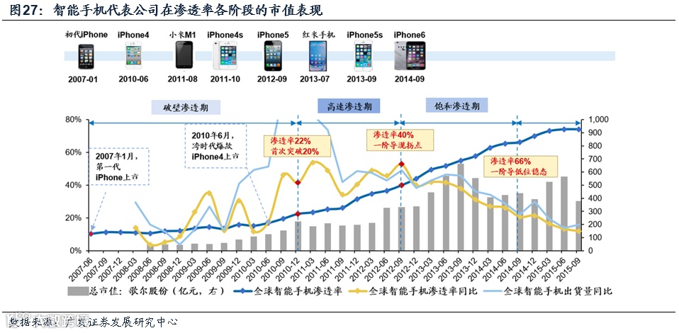 说明市场在产业周期的初始阶段,对于业绩的容忍度很高,而更在意技术和产品的突破。例如几个比较重要的iphone时刻:2010年的iPhone4,2013年的iphone5s,都是技术突破和销量热卖带来了相关产业链的主升浪。