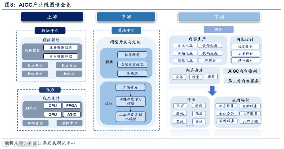从AIGC的产业链来看,目前大家将AIGC产业链分为上游(数据)、中游(算法)、下游(应用)。上游主要包括数据平台——提供数据和算力层——提供底层支持;中游为算法层,在原始数据的基础上进行模型的训练与二次开发;下游则为应用层,包括内容的生产与分发两个方面,涉及营销、推荐等多个应用场景。