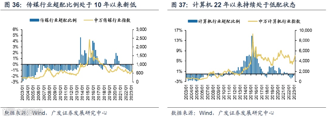 由于连续数年在A股表现欠佳,因此部分TMT行业基金配置已经降至历史底部。从22Q4最新基金持仓数据来看,传媒低配幅度已是10年以来新低,计算机22年也处于2010年以来最低配状态,虽然23年有逐级加仓但依然是低配。