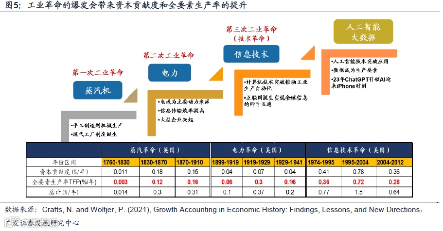 工业革命或技术革命的爆发,会带来资本深化与全要素生产率(TFP)提升。据Crafts, N. and Woltjer, P. (2021),蒸汽革命、电力革命、信息技术革命对全球经济带来深远影响,体现为全球资本要素贡献度在未来几十年得以深化,全要素生产率(TFP)大幅提升,从而形成对全球经济增长的贡献与拉动。