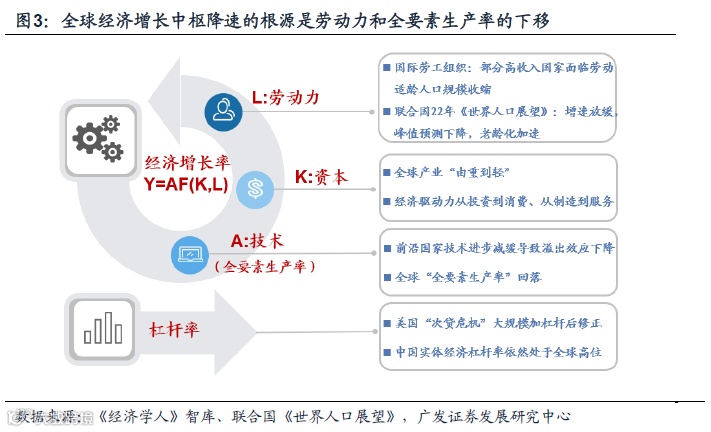 (1)全球劳动力增速下降&老龄化上升,国际劳工组织2023年《世界就业和社会展望》报告指出,部分高收入国家的劳动适龄人口已开始收缩,中国作为新兴经济体之一,劳动适龄人口自2015年开始收缩并呈现加速趋势;据联合国2022年《世界人口展望》,世界人口总量由高增长转为低增长,老龄化水平加速,人口结构将从青少年型变为中老年型;(2)全球资本投入效率下降,全球经济转型“由重到轻”,主要经济体的驱动力从投资切换至消费、从制造业过渡到服务业;(3)技术,前沿国家技术进步减缓导致溢出效应下降,全球“全要素生产率”回落;(4)杠杆率,以G2为例加杠杆最快速的阶段过去,美国疫情放松以来高杠杆率面临修正,而中国实体经济杠杆率平稳控制但依然处于全球横向对比高位。