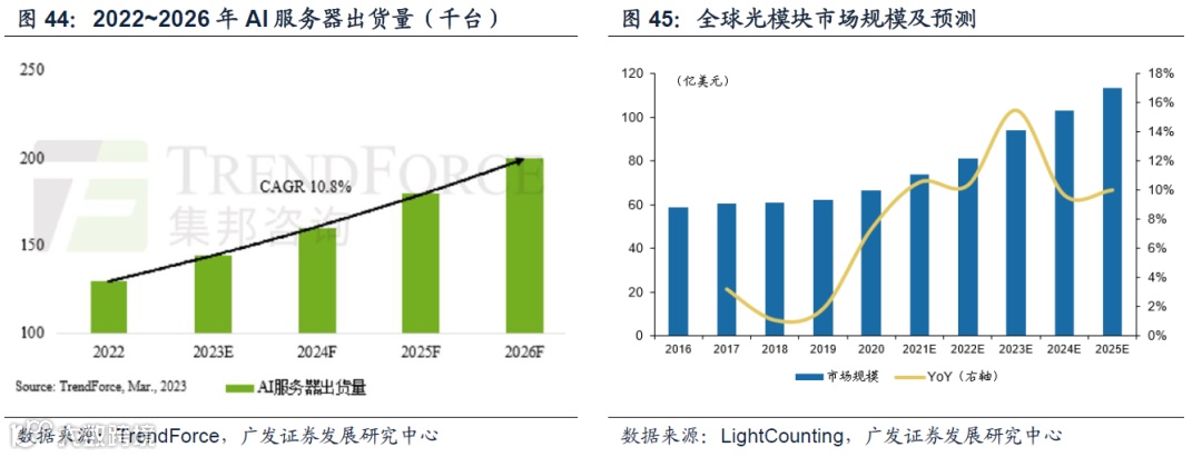 5.投资环节展望:下层建筑可率先追踪业绩(模型算力——AI芯片/服务器交换机/光模块光芯片/液冷温控/互联网),上层场景有广泛想象空间(应用端畅想——办公软件/智能家居/游戏/教育/智慧工厂)。