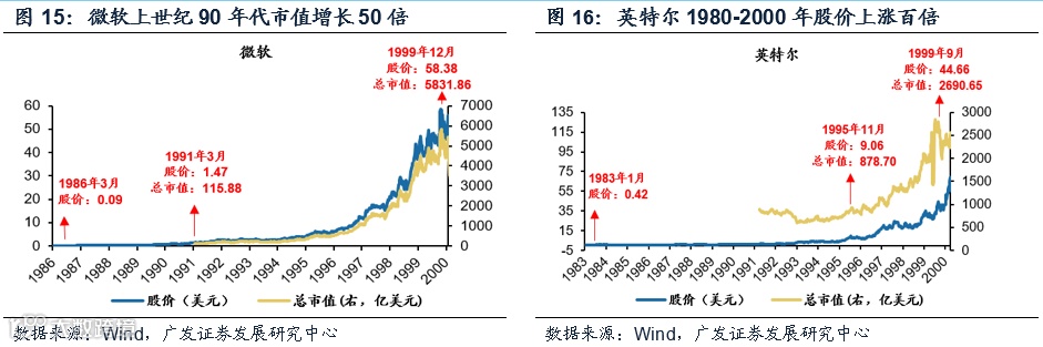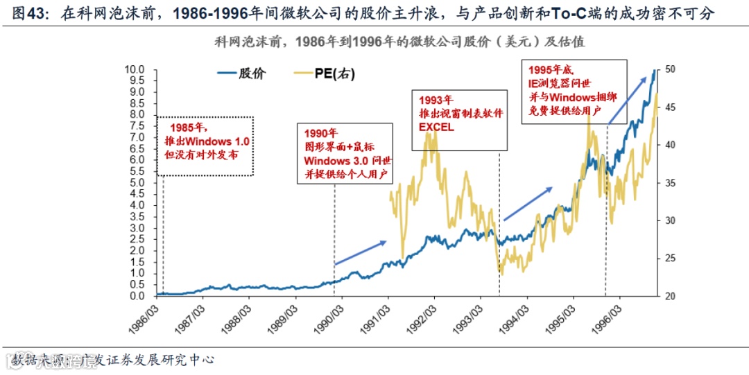 我们从历史上科技浪潮中英特尔、微软、苹果、雅虎等科技巨头的股价走势看到,技术或产品的爆点(微软90年Window3,英特尔93年奔腾处理器),和用户尤其是To-C用户场景的打开(苹果84年第一台面向个人的PC电脑,雅虎94年创造面向To-C用户的门户网站),这都是科技浪潮中股价主升浪的催化剂。