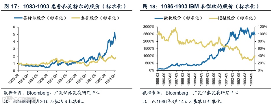第二:面向用户,尤其是打开To-C端使用场景。IBM公司在设立之初的客群一直是政府部门、军方、银行和科研院所,错过也缺乏经营To-C终端消费型产品的经验,在上世纪80-90年代的竞争中逐渐成为落伍者,93年IBM出现亏损也带来股价下跌,与其它竞争对手的市值涨幅差距拉大。