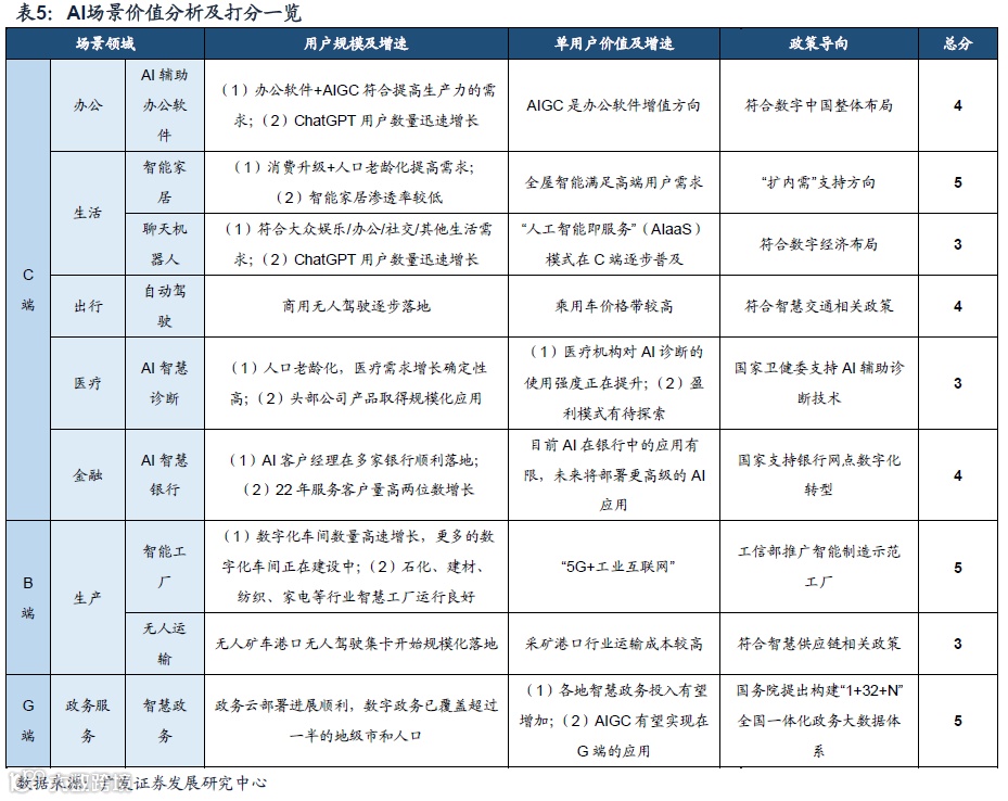 AI技术引领第四次场景革命,赋能生活、生产、办公、医疗、出行、金融等C端、B端、G端的重要场景领域,结合“五维度”场景价值分析框架,即用户规模及增速、单用户价值及增速、政策导向,可以优选出当前较为出色的AI场景:(1)办公软件:在内容生产领域具备天然的结合点,显著提升用户的工作效率,从软件产品向价值工具、生产力工具转变。(2)智能家居:有望解决人机交互弱、器件间交互弱的问题,提高全屋智能家居渗透率,进入全面互联阶段。(3)智能工厂:在生产调度、质量监控、机器人控制、设备预测维护、物流管理等场景实现更高效的智能生产。(4)智慧政务:通过资源整合、流程优化、业务协同,提高政府办公、服务、监管、决策的智能化水平。