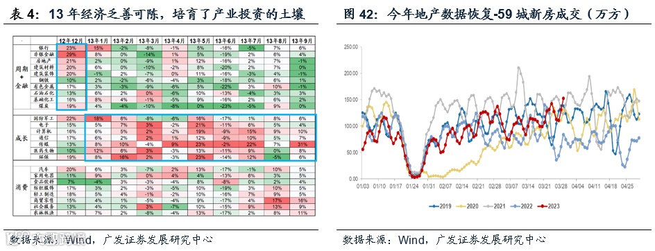 我们自1.18《23年买景气(g),还是买弹性(△g)》讲到:23年为经济触底复苏的拐点年,只要经济的“强预期”没有被证伪,市场就会不断寻找存在环比改善预期的行业(△g)。09年和16年:从【强预期】走向【强现实】,买环比改善△g(偏价值);13年和19年:从【强预期】走向【弱现实】,买景气g。