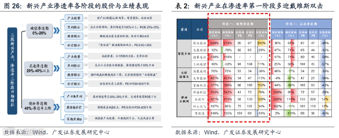 “破壁渗透期”对应着欣欣向荣的产业趋势、100%以上的盈利中枢,股价可实现“戴维斯双击”。从0到1,新产品/新模式/新场景破壁;少数前瞻的领军公司加大研发与资本开支以增强竞争力;竞争格局以垄断或寡头为主。龙头公司尽享爆发需求增长而业绩强劲。盈利增速往往至100%以上,ROE可达25%-35%;“拔估值”驱动戴维斯双击,PE达到80-200X。