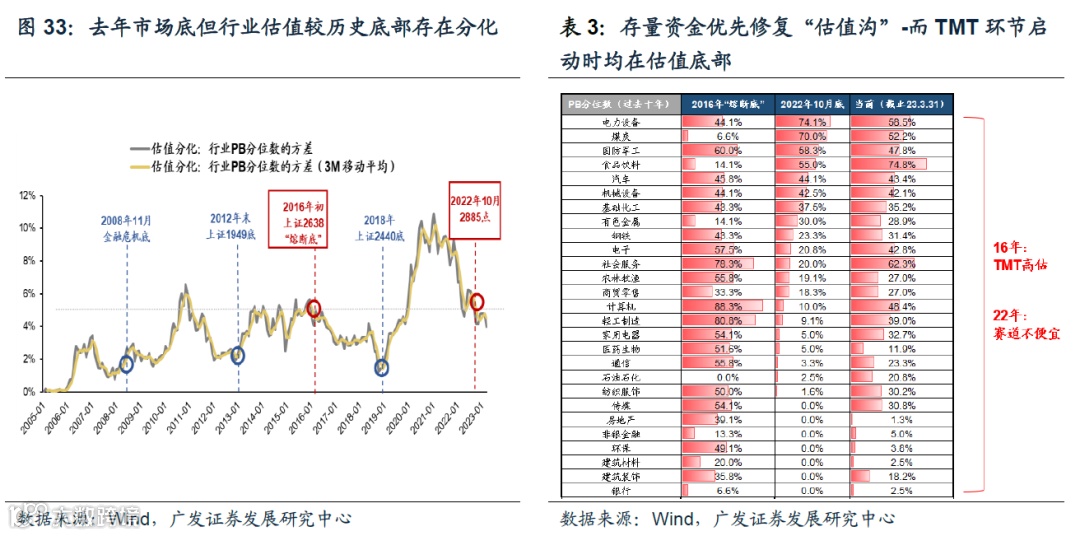 我们自1.18《23年买景气g,还是买环比△g?》来持续强调,22.10“市场底”并非所有行业“估值底”,各行业估值分化明显。存量资金优先进行的操作是填平“市场底”的“估值沟”——计算机(22年10月估值处于10%分位数,下同),电子(20%分位数),传媒(0%分位数),通信(3%分位数)。