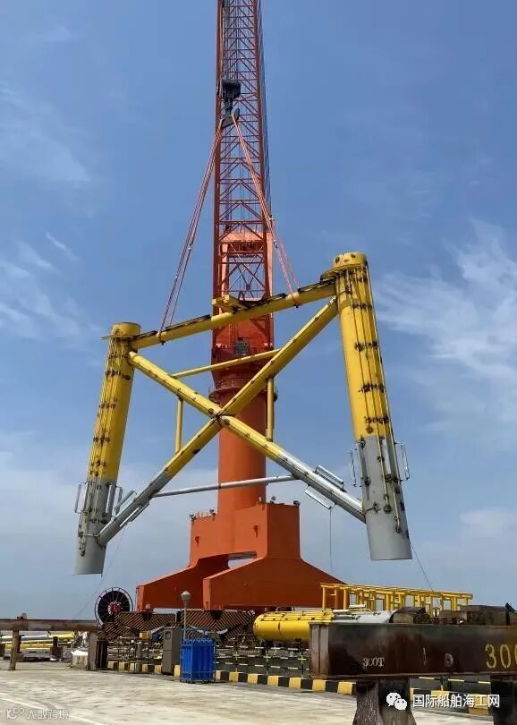 从远处看,升压站导管架犹如黄色巨人一般屹立在码头。如何保证这个“庞然大物”安全稳定的运输到指定的船舶上是个大问题。