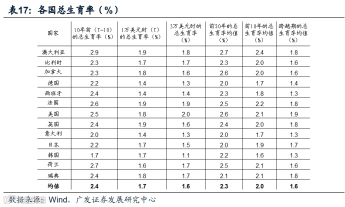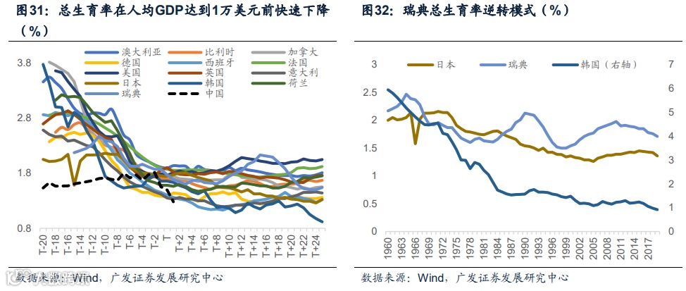 生育率角度,13个国家在人均GDP迈向1万美元时,已经处于工业化、城市化中后期,这一阶段出现了典型的“工业化生育率悖论”,即各个国家在工业化、城市化加速推进过程中,人口出生率随经济发展出现快速下降;而在1万到3万美元的跨越阶段,随着各国进入后工业化阶段,各国出生率基本在低位保持平稳,并未进一步继续大幅下降,并且在个别国家,如瑞典,还出现了总生育率逆转的趋势。此外,整个过程中,大规模移民能够显著抵消生育率的快速下行。