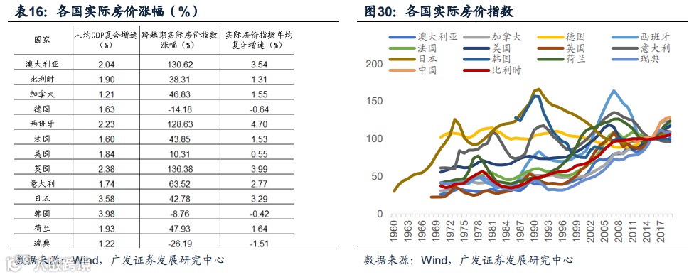 房地产发展角度,从实际房价指数的跨国比较来看,各国从高收入国家向中等发达国家的跨越期内,房地产的金融属性并不显著,各国的实际房价指数上涨幅度温和,各国的实际房价指数复合增长率与各国人均GDP的复合增长率基本吻合。