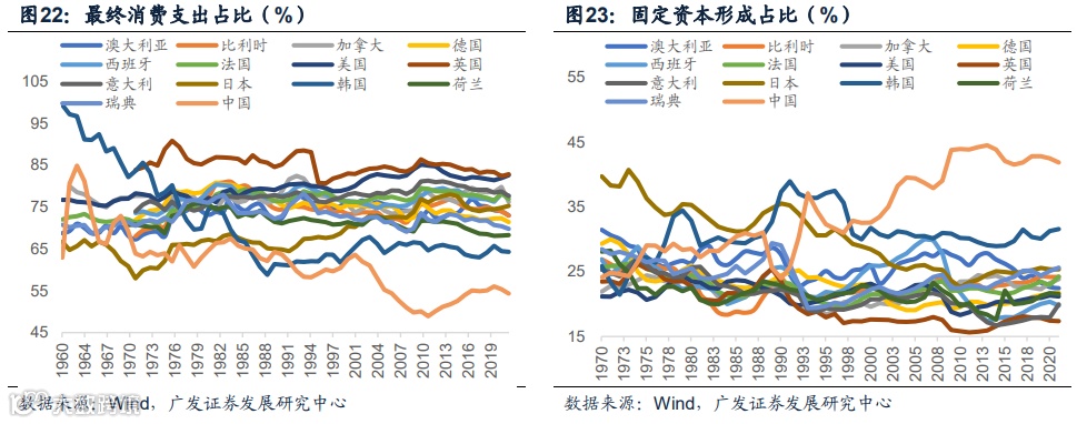 这或与中国过去40多年东亚赶超型经济体基础上的特殊发展模式有关。逻辑链条上,消费支出偏低与投资占比偏高有关,而中国投资占比偏高则是中国加速城市化过程中,高政府储蓄转化为高政府投资的结果。相较于各发达国家(不包括日韩)跨越期平均20.6%的储蓄率、日韩平均32.9%的储蓄率,中国2003-2022年20年的平均储蓄率为46.8%,而其中的政府储蓄是重要的组成部分,并且占比在持续上升,汪德华和李琼(2016)的研究指出“1998-2008年,中国的政府储蓄率已经从4.83%上升至11.98%”。