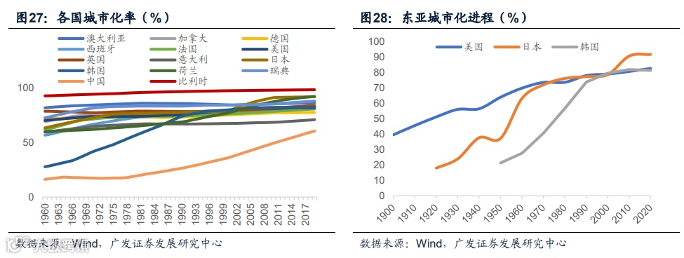 此外,城市化进程在不同类型的国家也展现出不同的特征,特别是对于东亚模式的韩国与日本,其在推进城市化过程中有典型的加速特征,但加速阶段主要发生在人均GDP达到1万美元之前,用30年的时间走完发达国家近百年才能走完的城市化进程。