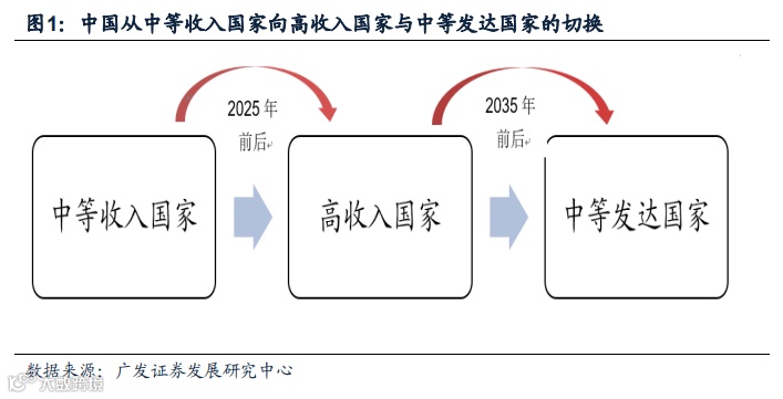 到2049年中国建成社会主义现代化强国之前,在中国式现代化推进过程中,存在两个重要时间节点:2025年与2035年,分别对应中国人均GDP需要达到的两大重要目标:首先达到高收入国家标准,之后达到中等发达国家水平。
