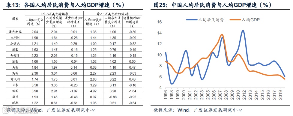 而在刚跨越1万美元后的前5年,除去美国与意大利人均居民消费复合增速显著高于人均GDP复合增速,分别高出0.47%与0.43%,比利时、法国与英国两者相当外,其它8个国家人均居民消费复合增速则显著低于人均GDP复合增速,其中韩国、荷兰、加拿大、瑞典与德国出现较大比例的偏离,分别低出1.64%、0.95%、0.82%、0.54%与0.49%。