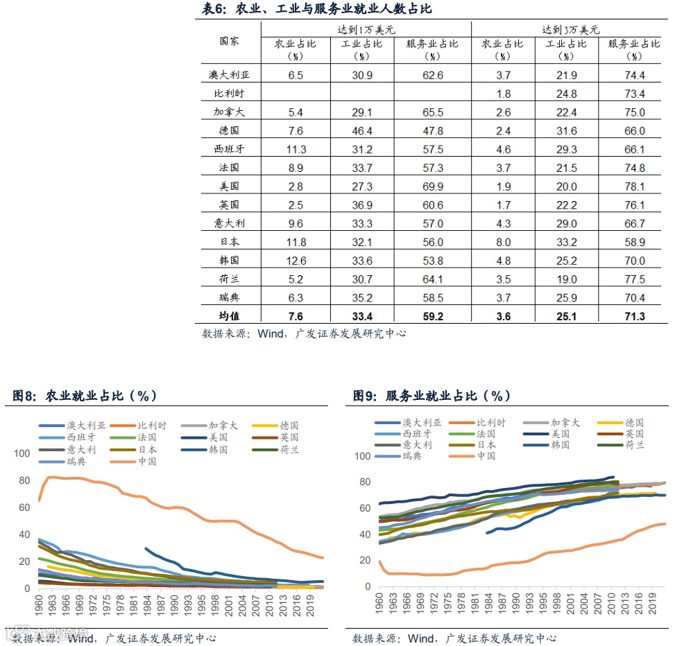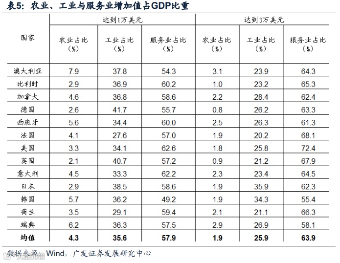 对比来看,2019年中国人均GDP达到1万美元,此时中国农业增加值占比为7.1%,工业增加值占比为39%,服务业增加值占比为53%。与各中等发达国家跨入1万美元时大致类似,中国农业占比较各国的均值4.3%高2.8%,而服务业占比较各国均值57.9%低4.9%,或指向中国服务业发展略晚,但也可能与服务业统计难度大,统计的完备性不够有关。就业份额方面,中国达到1万美元时,农业就业占比为24.7%,远高于同阶段的各个发达国家,服务业就业占比为48%,服务业就业占比远低于同阶段的各个发达国家,未来服务业就业比重或将不断提升、农业就业比重需进一步下降。