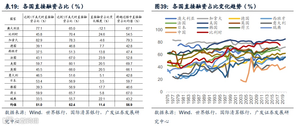 第一类是以英国、美国为代表的市场主导型直接融资国家,跨越过程中其直接融资占比均值超过60%,此外还包括澳大利亚、加拿大、荷兰三国,这些国家是典型的市场经济国家,属于技术前沿国家,并且资本市场体系十分发达,直接融资占绝对主导,服务于这些国家的技术创新与产业升级。