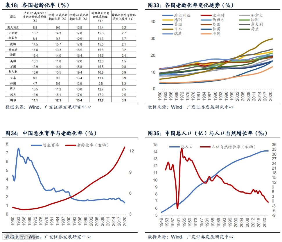 经验规律六:各国在1万美元前存在典型的“工业化-生育率悖论”,人口出生率随经济发展快速下降;但在1-3万美元的跨越阶段,出生率下降变为低位平缓,瑞典甚至出现总生育率逆转的趋势。跨越前,日韩总生育率均值最低。各中等发达国家的人口老龄化率均持续上升,日韩上升相对最快。
