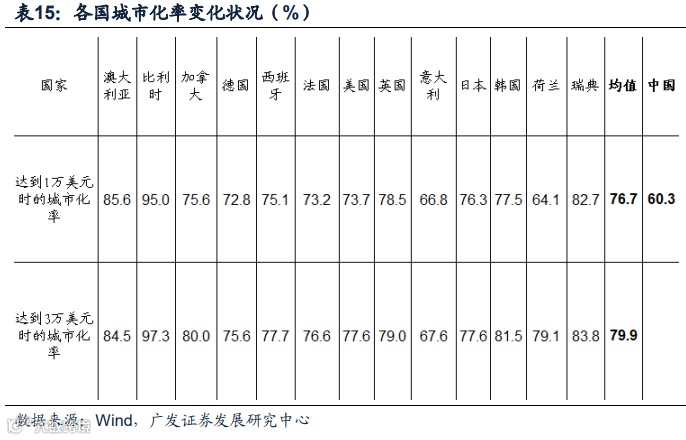 七、2019年人均GDP达到1万美元时,中国的城市化率为60.3%,显著低于各国同阶段76.7%的均值水平,仅处于城市化的中期阶段,未来还有较大发展空间;