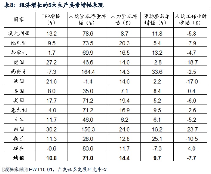 增长要素层面,人均GDP的增长由全要素生产率(TFP)、人均资本存量、人力资本、劳动参与率与人均工作小时5个要素共同决定。各国在跨越过程中存在两点规律,首先,方向上,TFP、人均物质资本存量、人力资本与劳动参与率在跨越阶段是增长的,而人均工作小时是减少的;其次,幅度上,人均物质资本存量在这一阶段增长幅度最大,平均增幅为71%,TFP、人力资本与劳动参与率的平均增幅在10%左右,而人均工作小时在此期间平均减少7.7%。