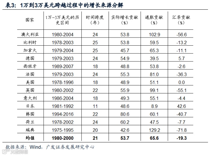 经验规律一:在从1万到3万美元的跨越中,一般本国实际增长大约贡献一半;名义价格变动(本国通胀+本币相对美元汇率变动)贡献另一半。其中通胀与汇率两者贡献呈现跷跷板效应,即通胀上行带来名义贡献,但会内生汇率贬值,二者综合起来形成实际增长之外的贡献。值得注意的是,多数案例显示跨越过程中汇率并不必然升值,设定增长目标应大致假设汇率中性。