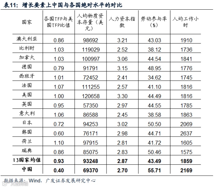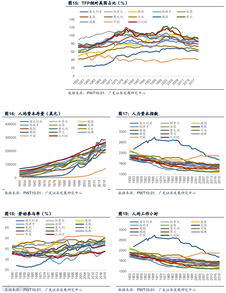 各要素绝对水平对比来看,中国的TFP与人均资本存量水平较低,人力资本水平相当,劳动参与率与人均工作小时偏高。