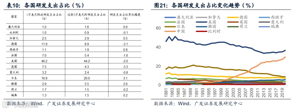 技术优势上,中国PCT专利申请量的全球占比于2019年首次超过美国,2022年最新的全球占比达到25.2%,已连续三年超过美国,成为全球PCT专利申请数量最多的国家;行业占比层面,中国占比最高的主要有数字通信、计算机技术、视听音像技术、电动机械仪器能源、半导体、测量仪器、光学仪器、电子通信、医疗技术仪器等;从中期的动态增长维度来看,我国增长较快的领域与日本、德国表现较为接近,但在美国近年来的优势领域,如生物技术、制药、微结构和纳米技术等,中国占比始终偏低,仍有上升空间(见广发宏观《中国PCT专利:第一背后的结构特征与方向》)。此外,2020年购买力平价下的国内研发支出达到5828亿美元,为美国的81%,全社会研发经费从2012年的1万亿元增加到2022年的3.09万亿元,研发投入强度从1.91%提升到2.55%,表明中国的科技投入在不断提升,这将加快中国技术优势的形成。