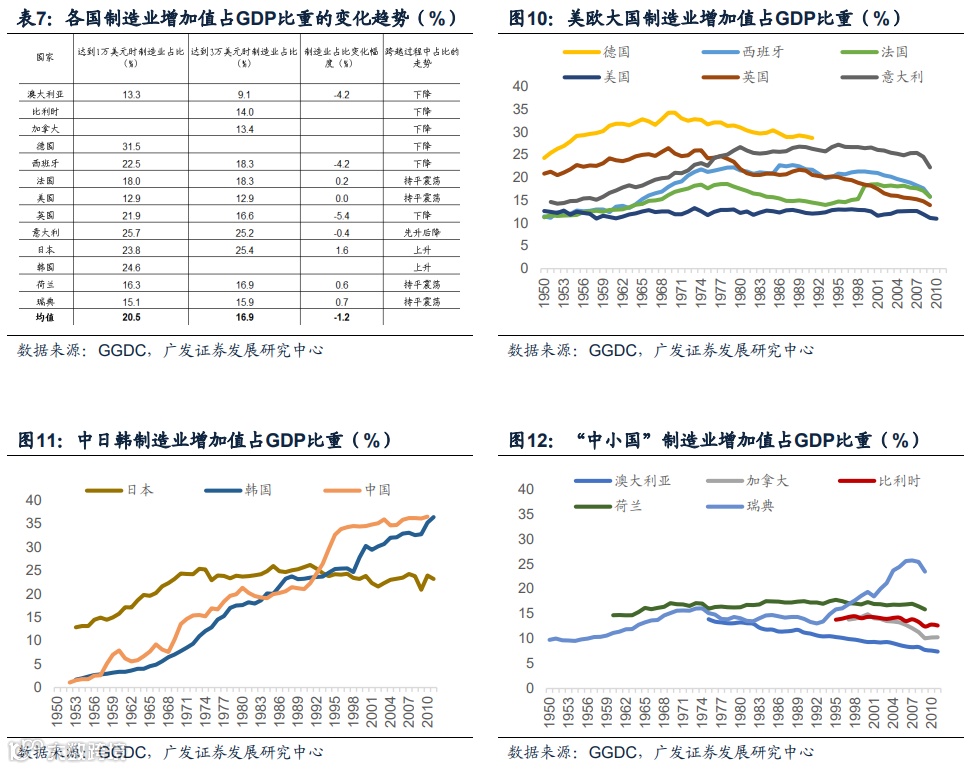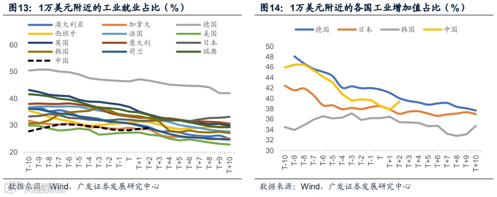 进一步看制造业占比,当各国人均GDP达到1万美元时,平均的制造业增加值占比在20.5%附近,跨越过程中,制造业占比随着各国经济的进一步发展出现下降态势,经20年左右均值下降到迈过3万美元时的16.9%,下降3.6个百分点。
