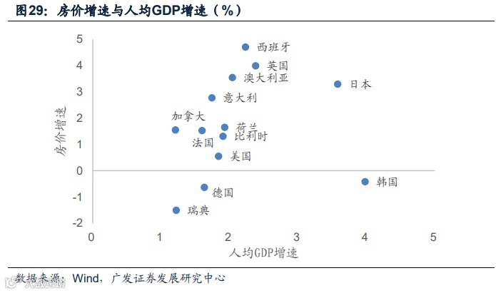 具体来看,跨越期内澳大利亚、西班牙与英国的实际房价涨幅超过一倍,年度复合增速超过3.5%,是房价增速最高的三个国家。此外,日本的房价复合增速也超过3%,但在高储蓄、高投资模式下,日本的实体经济增长速度高于前面三个国家,具有更高的人均GDP增速。相较其它国家,这四个国家是13个国家中人均GDP复合增速最高的国家。此外,13个国家中有3个国家在跨越期出现了实际房价指数负增长,分别是德国、韩国与瑞典,并且美国在这一跨越阶段也并未出现房价的大幅上涨。