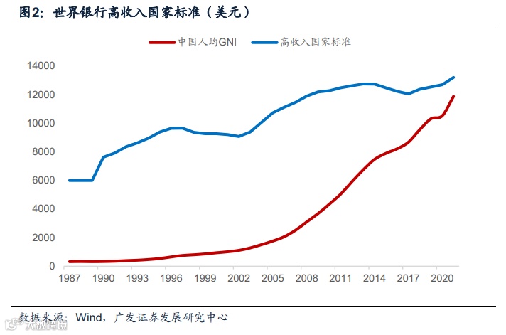 在此期间,中国人均GNI从1987年的320美元提升至2021年的11880美元,近5年的年均增速在7%左右,绝对值距离跨入高收入国家仅相差1325美元,百分比上差距11.2%,按照近期4.6%的相对追赶速度,预计中国将于2024年跨入高收入国家行列。