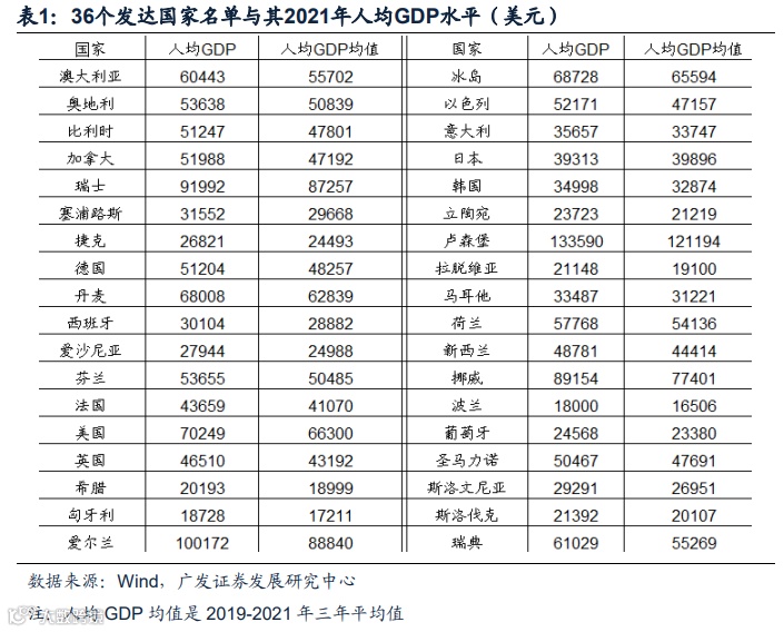 进一步将36个发达国家样本,按各个国家收入水平由低到高分为两组,取上半组人均GDP的均值或者中位数作为“中等发达国家”的门槛标准,计算可得,2021年上半组人均GDP均值为29283美元,人均GDP中位数为28618美元。从而,当下中等发达国家的门槛值约为3万美元。