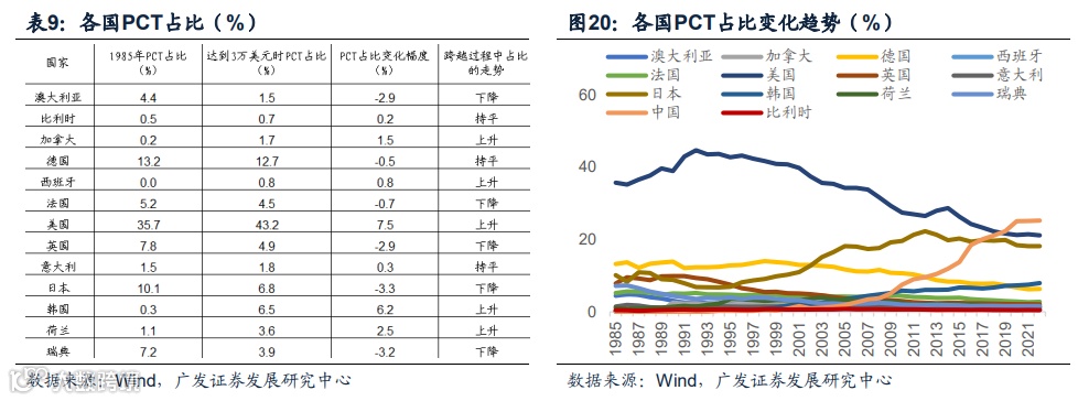从1985年后各国PCT专利申请量的全球占比可以分析出全球各国的技术优势格局状况。在1985年,各国人均GDP刚迈入1万美元时,美国占据绝对的技术优势,其PCT专利申请量占全球的35.7%,此外,德国与日本大致相当,分列第2、3位,分别占比13.2%与10.1%,美国、德国、日本三个国家加总占比达到全球的59%,意味着全球的创新活动主要被这三个国家主导。英国、瑞典、法国与澳大利亚PCT占比超过4%,位列第四至第七位,分别达到7.8%、7.2%、5.2%与4.4%,四个国家合计占比达到24.6%,前7个国家合计占比83.6%,当时几乎垄断了全球的PCT申请。
