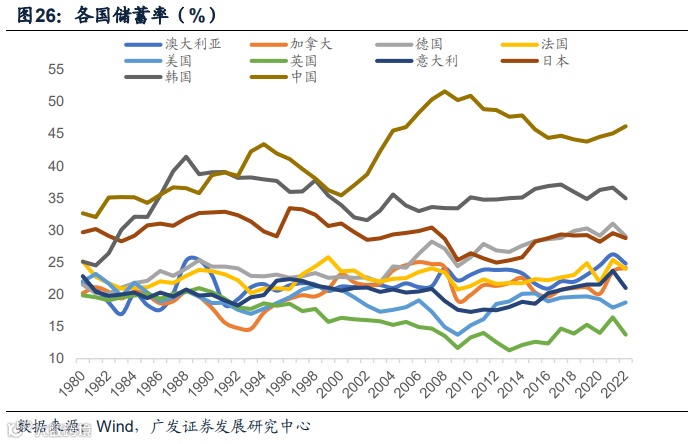需求结构层面,现阶段中国的最终消费占比偏低,2019年占比为56%,而固定资本形成占比43%,高于各发达国家跨越期初26%的均值水平,这与中国过去40多年东亚赶超模式基础上的特殊发展模式有关。逻辑链条上,消费支出偏低与投资占比偏高有关,而中国投资占比偏高则是中国加速城市化过程中高政府储蓄转化为高政府投资的结果,相较于各发达国家(不包括日韩)跨越期平均20.6%的储蓄率、日韩平均32.9%的储蓄率,中国2003-2022年20年的平均储蓄率为46.8%,而其中的政府储蓄是重要的组成部分,并且占比在持续上升。
