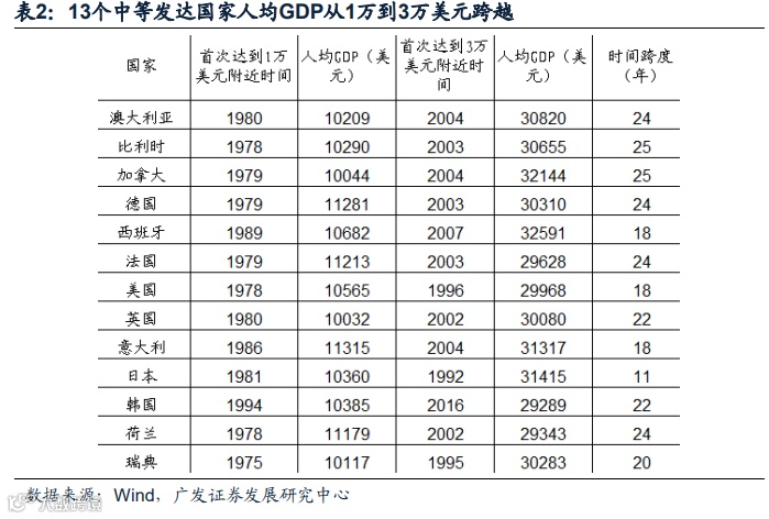 根据世界银行WDI数据库,可整理出各个国家现价美元下,人均GDP从1万到3万美元的历史区间,发现13个国家中有10个国家在1980年附近人均GDP达到1万美元,有11个国家在2000年附近人均GDP达到3万美元,绝大部分国家需经20-25年左右才能实现人均GDP从1万美元到3万美元的跨越。