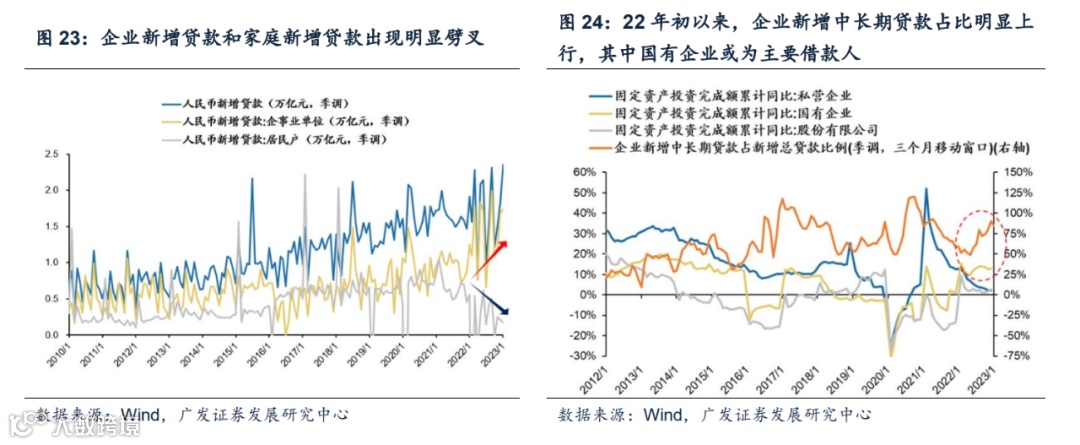 ROE提升路径之三:提高杠杆率。社融数据显示,当前国有企业可能是近期“借款人”的主力军。(1)企业新增贷款和家庭新增贷款出现明显劈叉——从企业和家庭新增贷款数据来看,1-2月家庭新增贷款(季调)偏弱,而企业新增贷款(季调)显著冲高。——22年初以来,企业新增中长期贷款占比明显上升,而同时私营企业及股份有限公司的投资持续下滑,仅国有企业投资同比长期保持相对高位。